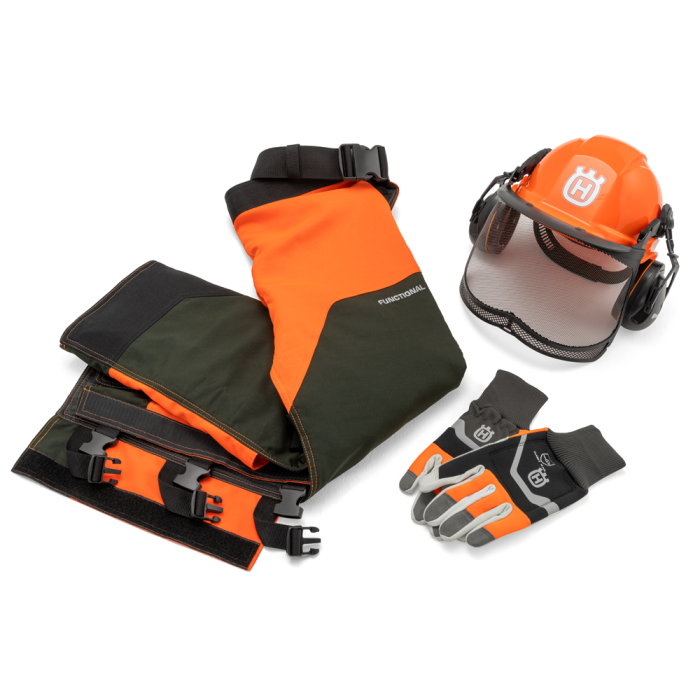 A convenient starter kit providing essential chainsaw protection: helmet with visor and hearing defenders, cut-resistant gloves, and protective chaps.