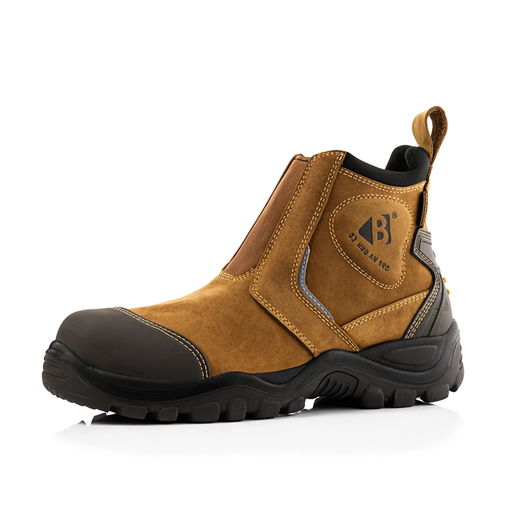 The Buckler “Bang Guardz” Dealer Safety Boot (model BSH014BR-04) combines the convenience of the dealer (slip-on / elastic-side) style with high-level safety features. Developed under Buckbootz’s bANg guardz® line, this boot includes EN/UKCA-certified ankle protection, waterproof design (even the elastic sections), and a full composite safety specification.
